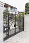 展示場に何度かお越しいただき、打ち合わせを重ねてご要望を反映した門扉です。アイアンの重厚感、存在感を重視しながら、車の出し入れや兼通用扉としての利用など、日常の中での使いやすさも意識されていました。そこで扉のワイドを約820mmに設定、奥行きを取らない4枚の折れ戸仕様としました。全開時は3400mm程度と、車の出し入れが楽にできる幅を確保しています。ちなみに高さは約2760mmで、上のアーチのように見える飾り部分は、一見一体型のように見えますが、4枚の各扉とともに4つに分かれて折りたたまれます。お施主様も門扉を締めたときの一体感と、バラのオブジェを特に気に入って頂けたようです。