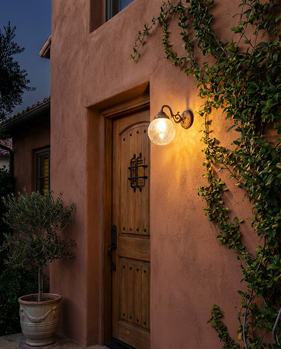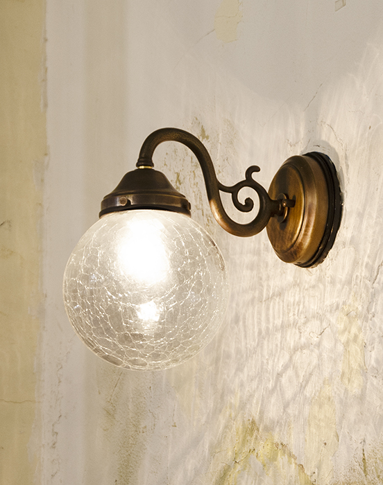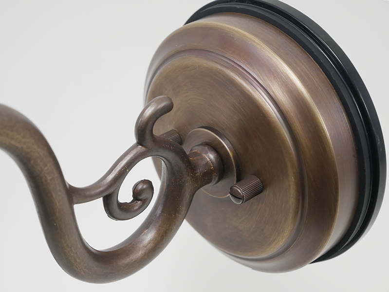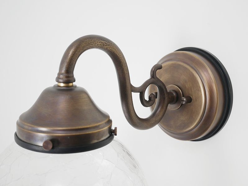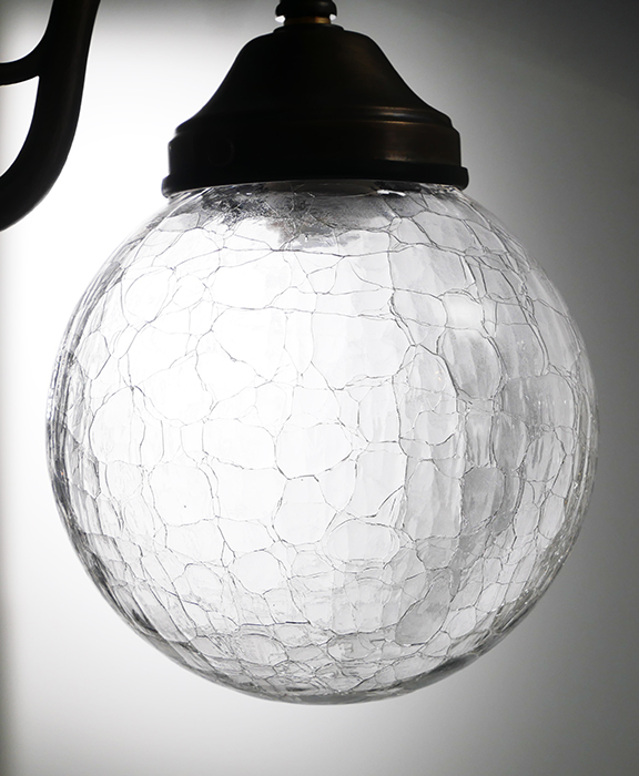 真鍮アンティーク仕上げのベースに、オーソドックスなスクロールアームを組み合わせたデザイン。クラック調ガラスのシェードが光を乱反射し、幻想的で上品な趣を演出します。