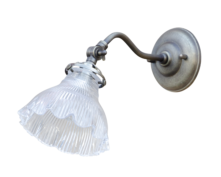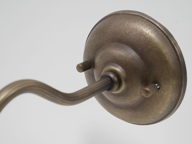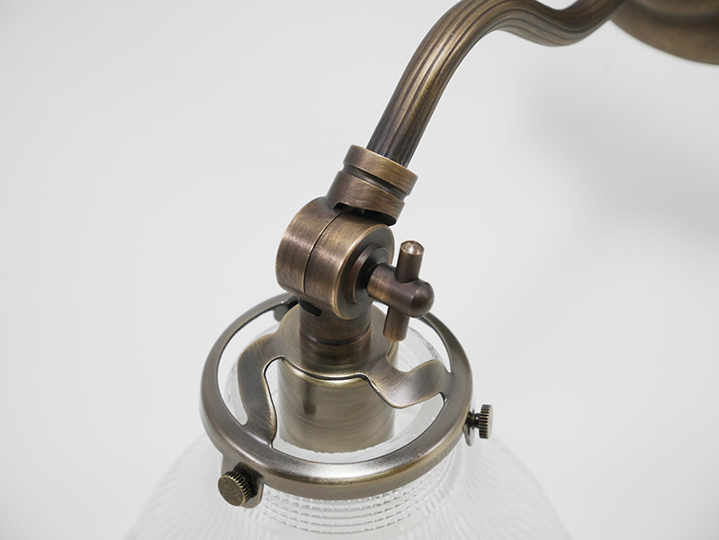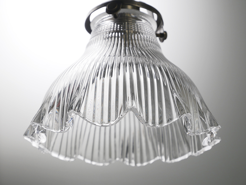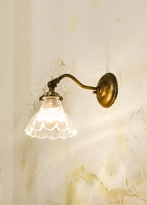 曲線美が特徴のシンプルな真鍮パイプに、波打つフォルムのガラスシェードを組み合わせたデザイン。シェードは角度調整が可能で、リブガラスが光をやさしく拡散して空間全体に広がります。