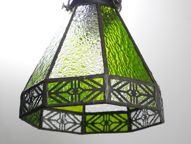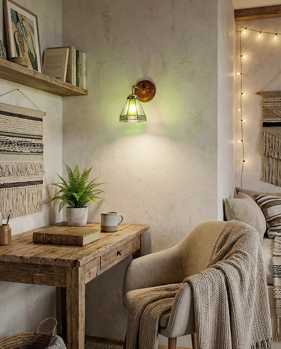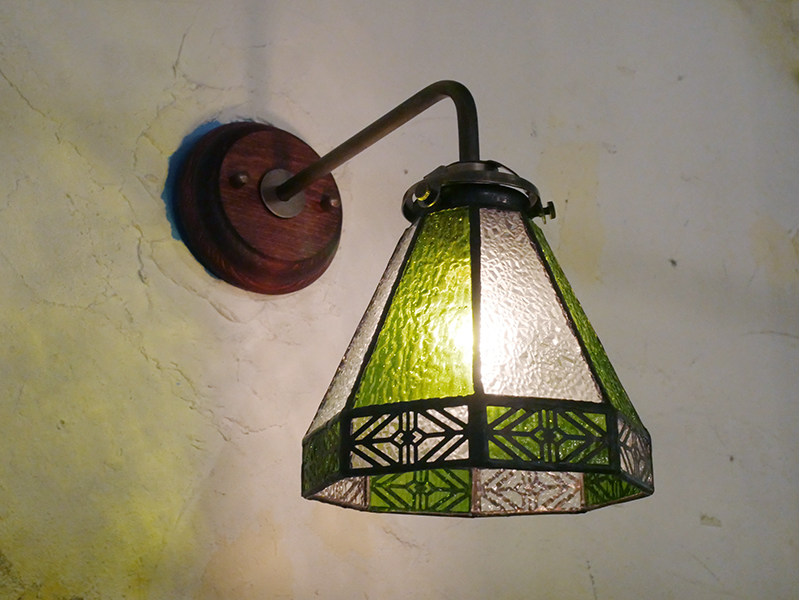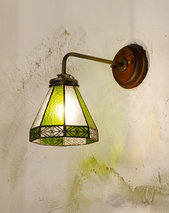 飾り気のないシンプルな真鍮アームが、カラフルなステンドグラスの美しさを引き立て、心温まるゆったりとした空間を演出します。