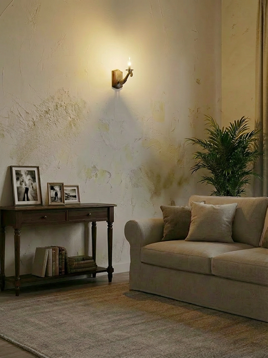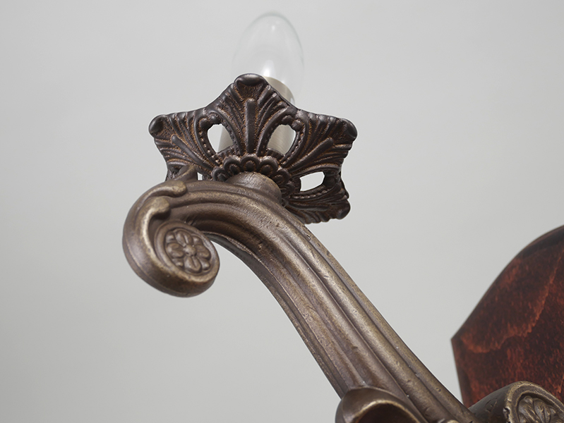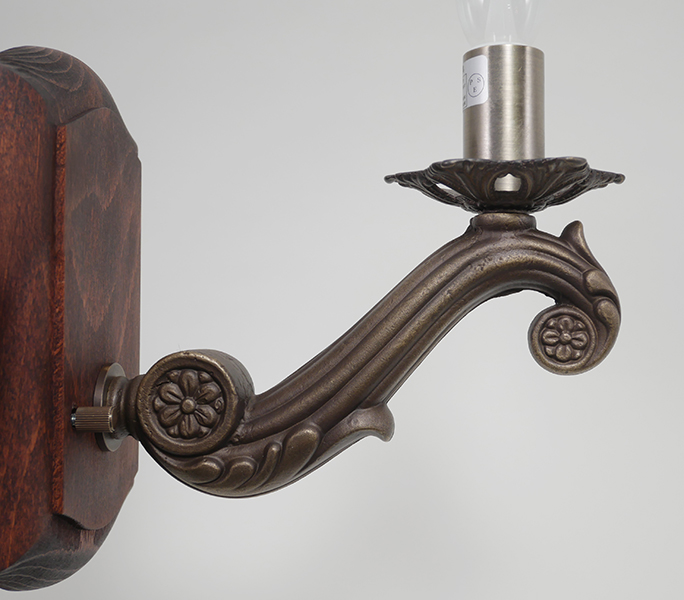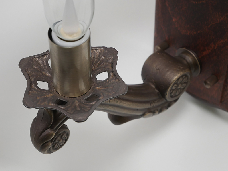 木製フランジと真鍮鋳物のレリーフアームを組み合わせた、上品な印象の照明。テーマパークに並んでいそうな存在感を放ち、レストラン空間のアクセント照明としても映えるデザインです。