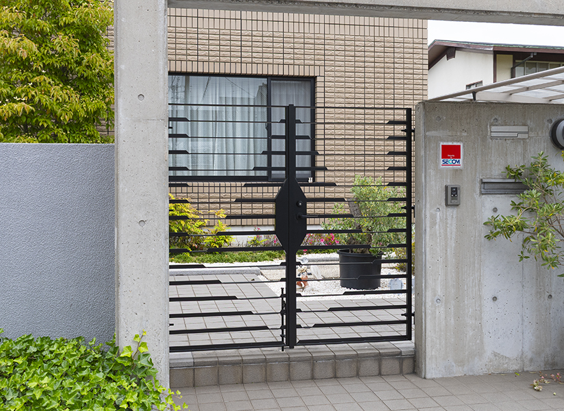 横桟には6×25mmのフラットバーを使用し、途中にV字状の切れ込みを施して90度捻じる加工を加えています。この捻じれた部分の配置により独特のシルエットが浮かび上がるデザイン。捻じる場所によってさまざまな画像が現れるため、オリジナルの模様を浮かび上がらせる特注対応も可能です。