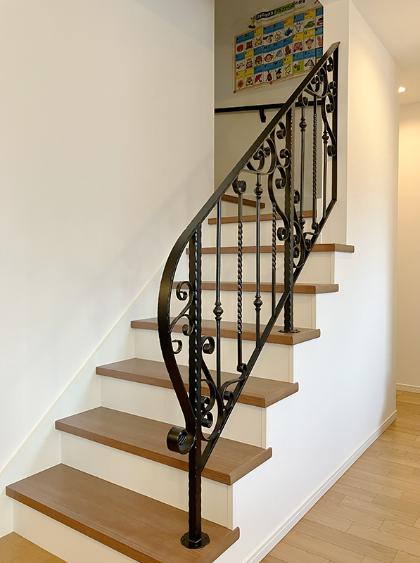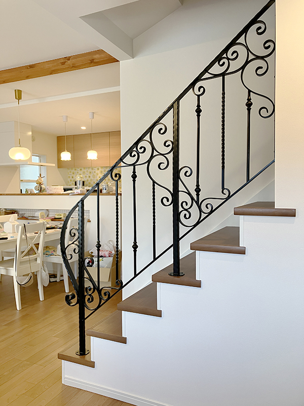 上下両端のスクロールには、あえて定番の6×12mmではなく、より太めの6×20mmを用いることで、視覚的なアクセントと重厚感をプラス。屋内外問わず幅広く採用されており、特に女性から支持されているロートアイアン手すりです。