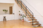笠木には無垢のフラットバーを採用し、シャープで無駄のない美しさを追求したデザインです。硬質な磨き材を使用し、6mm厚の支柱ベースによって優れた強度を確保。支柱は横方向からの静荷重100kgにも耐えられる設計です。また、ジョイント部もフラットに仕上げるなど、細部まで丁寧に作り込まれており、安定した人気を誇る手すりです。