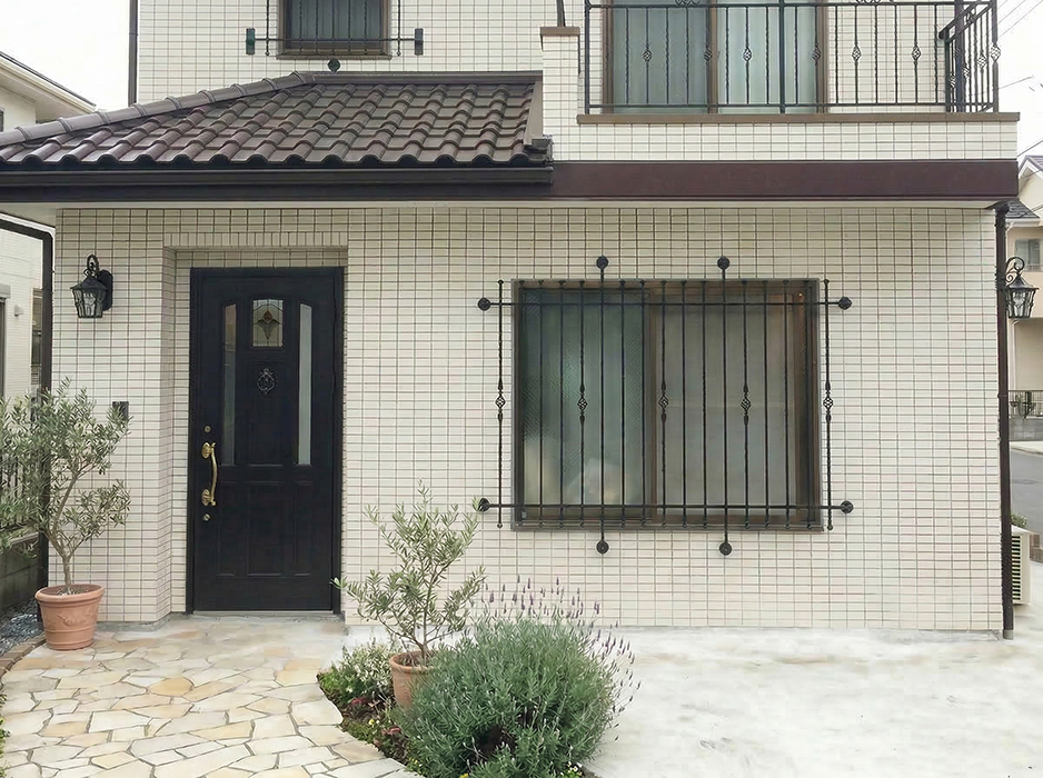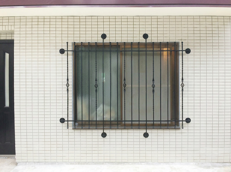 プレーンとネジリを組み合わせた縦格子に、上下にはボール型のフィニアルをあしらったデザインがベース。さらに中央部分に配置された、叩き潰し加工とケージ装飾を組み合わせたバーが印象的で、特徴的で存在感のあるロートアイアン面格子に仕上がっています。