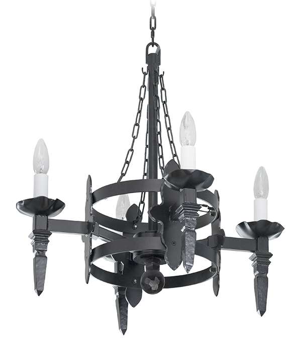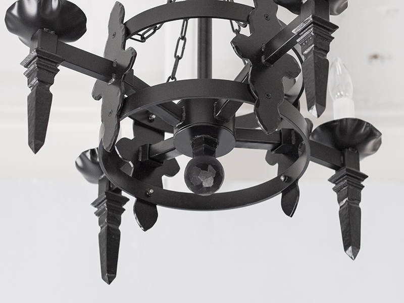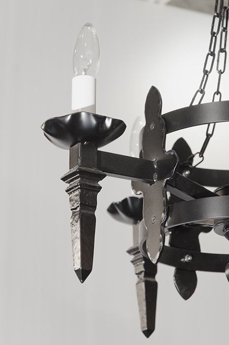 キャンドルライトを支える持ち出しプレートにはハンマー叩きの仕上げを施し、キャンドルカップも一つひとつを手作業で成形し、それぞれが異なる表情を持っています。チェーンがアクセントとなった、素朴で飾りすぎないロートアイアン製のシャンデリアです。