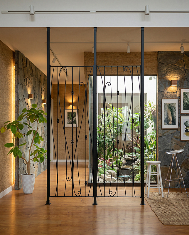φ13mmの丸棒をすべて縦方向に伸ばした、こだわりの意匠が特徴です。自由に伸びる曲線同士をうまく溶接し、強度を確保。凛としたラインが印象的な、美しさと力強さを兼ね備えたロートアイアンのパネルです。