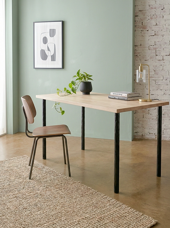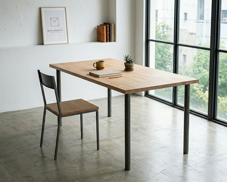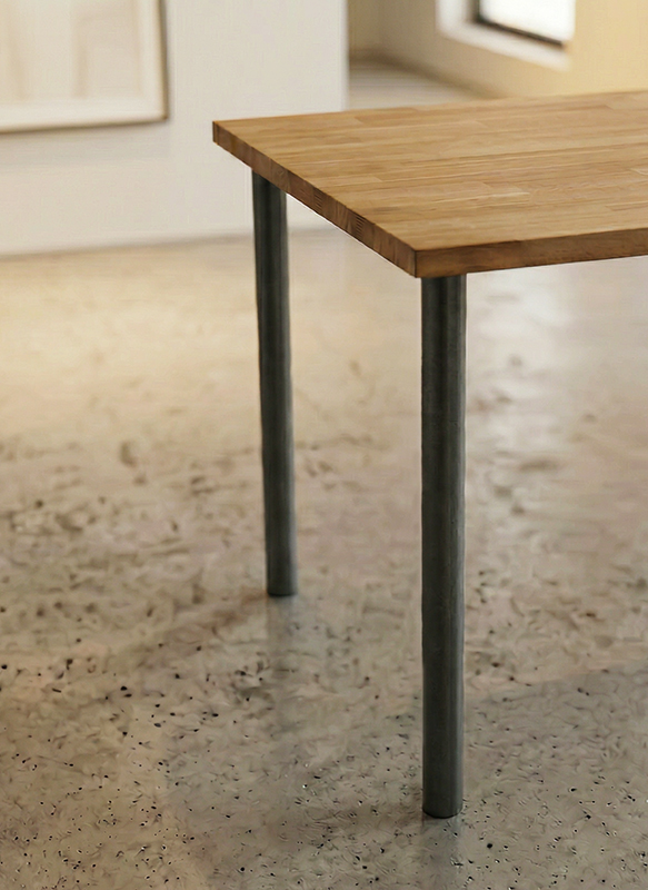 肉厚の丸パイプを打ち出しで仕上げた、シンプルかつ堅牢なテーブル脚。素朴で力強い表情を持ち、ひとつひとつ異なるタタキ模様が、手作業ならではの温もりを感じさせます。
