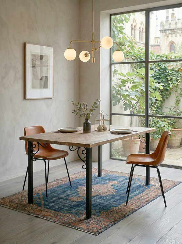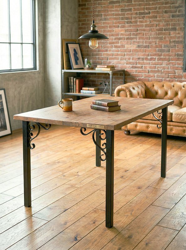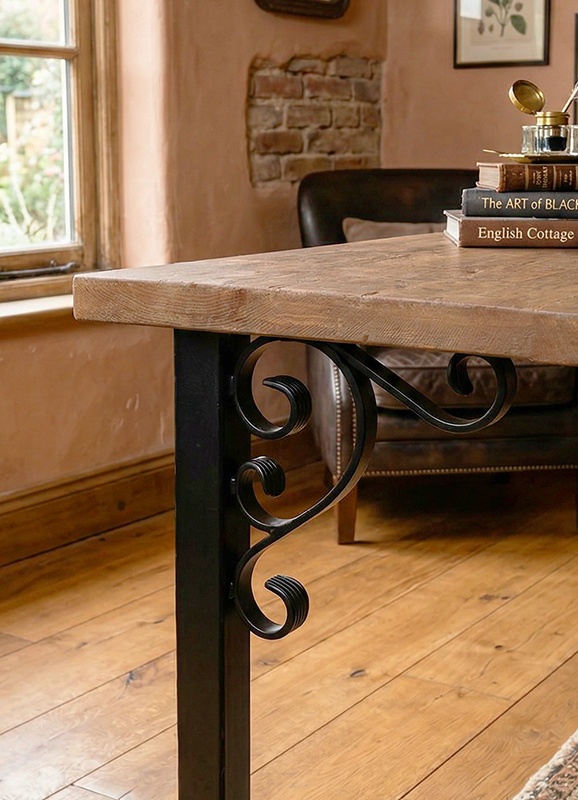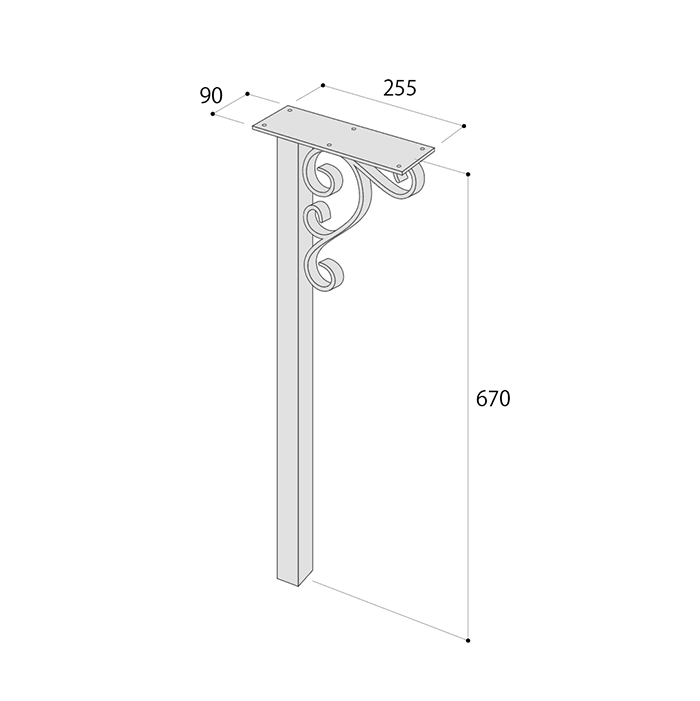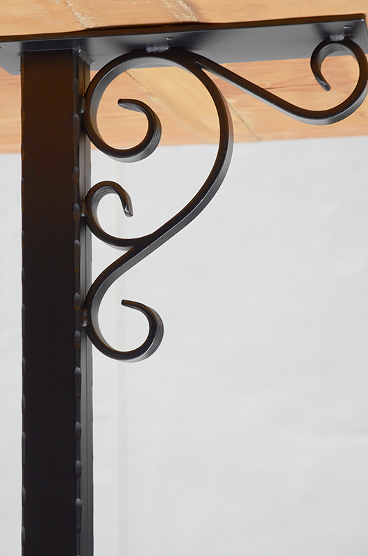 コーナーにハンマー加工を施した40mm角パイプに、ワンポイントでスクロール意匠を加えたデザイン。装飾性を持ちながらも、タフな使用にも応える高い強度を備えています。