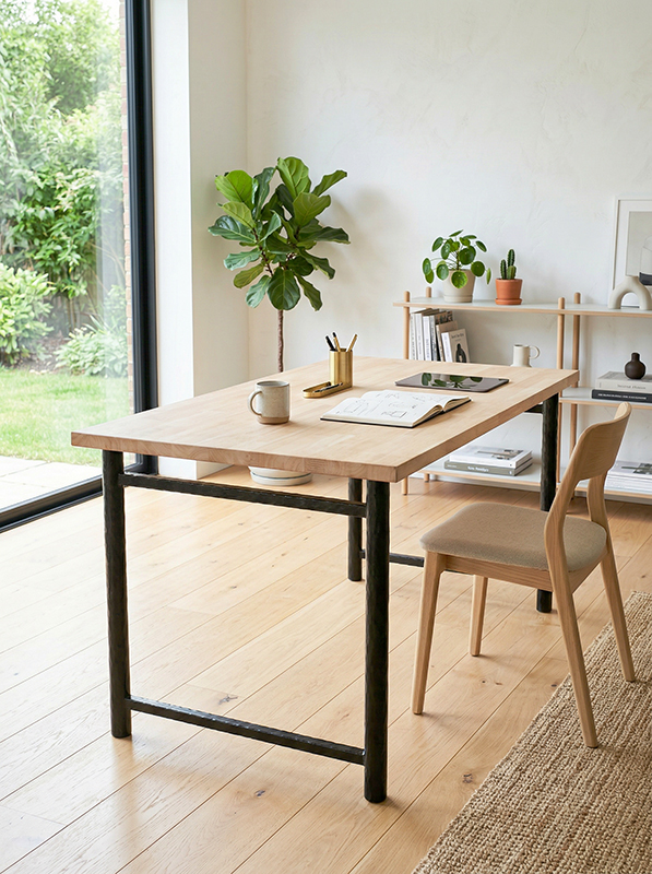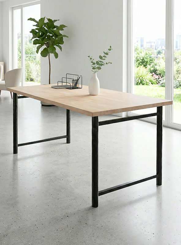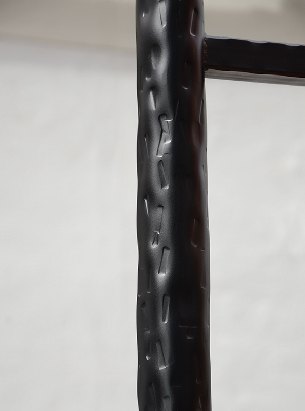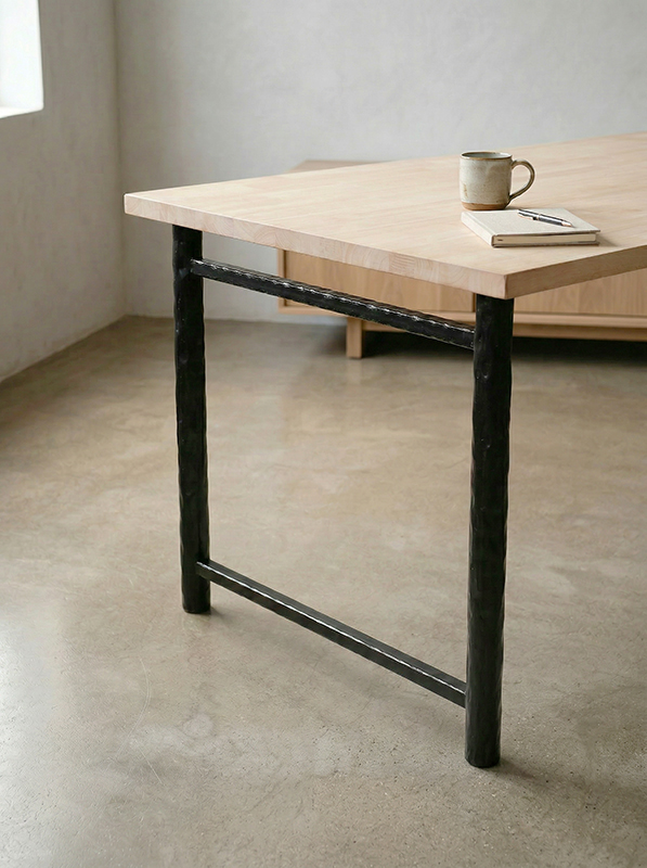 肉厚の丸パイプを打ち出しで仕上げた、シンプルかつ堅牢なテーブル脚。素朴で力強い風合いと、一本ごとに異なるタタキ模様が手仕事の温かみを演出します。